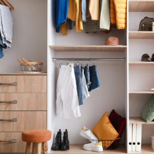 Evelines grootste ruimtetip? Ze heeft één grote walk-in-closet ontworpen waarin ze alles, maar dan ook álles, bewaart: zomerspullen, haar bruidsjurk, ski’s, boekhouding, sportkleding. “Een inloopkast in een tiny house klinkt misschien als een contradictie, maar de indeling van deze kast – überhaupt de kast zelf – was een essentieel onderdeel bij het ontwerpen van mijn tiny house. Nu heb ik één ruimte voor al mijn spullen. Hartstikke overzichtelijk, want hierdoor weet ik precies wat ik heb.”